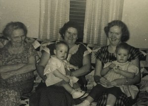 Four generations of Mama’s family in 1960: my mother Arzelia (holding me, far right) seated beside her mother Jerushia (holding my sister Lisa), and her grandmother Madge (left).