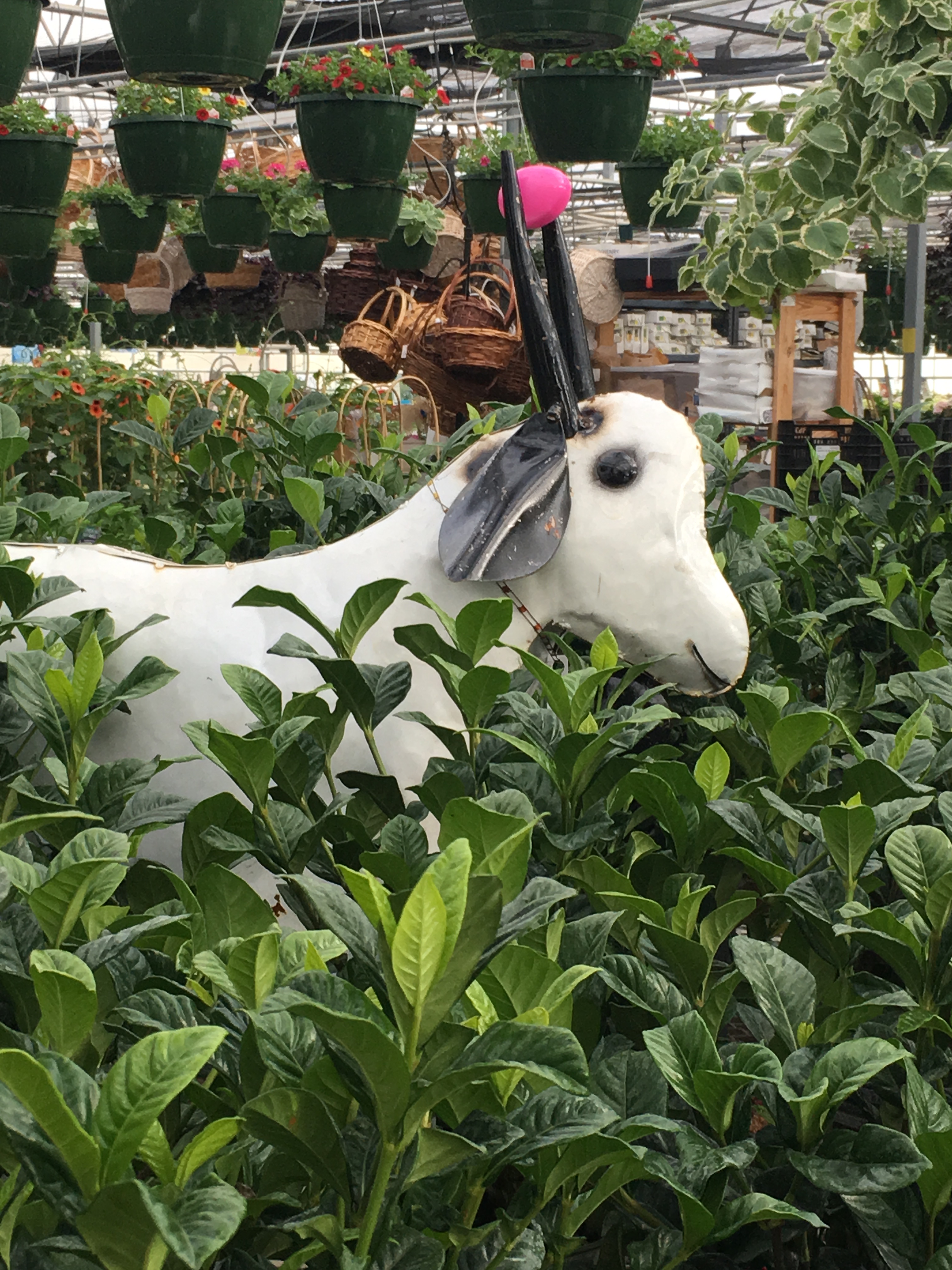 The metal garden art goat (ceremoniously and unceremoniously) decked out for the annual Easter Egg Sale today at Stanley’s Greenhouse.