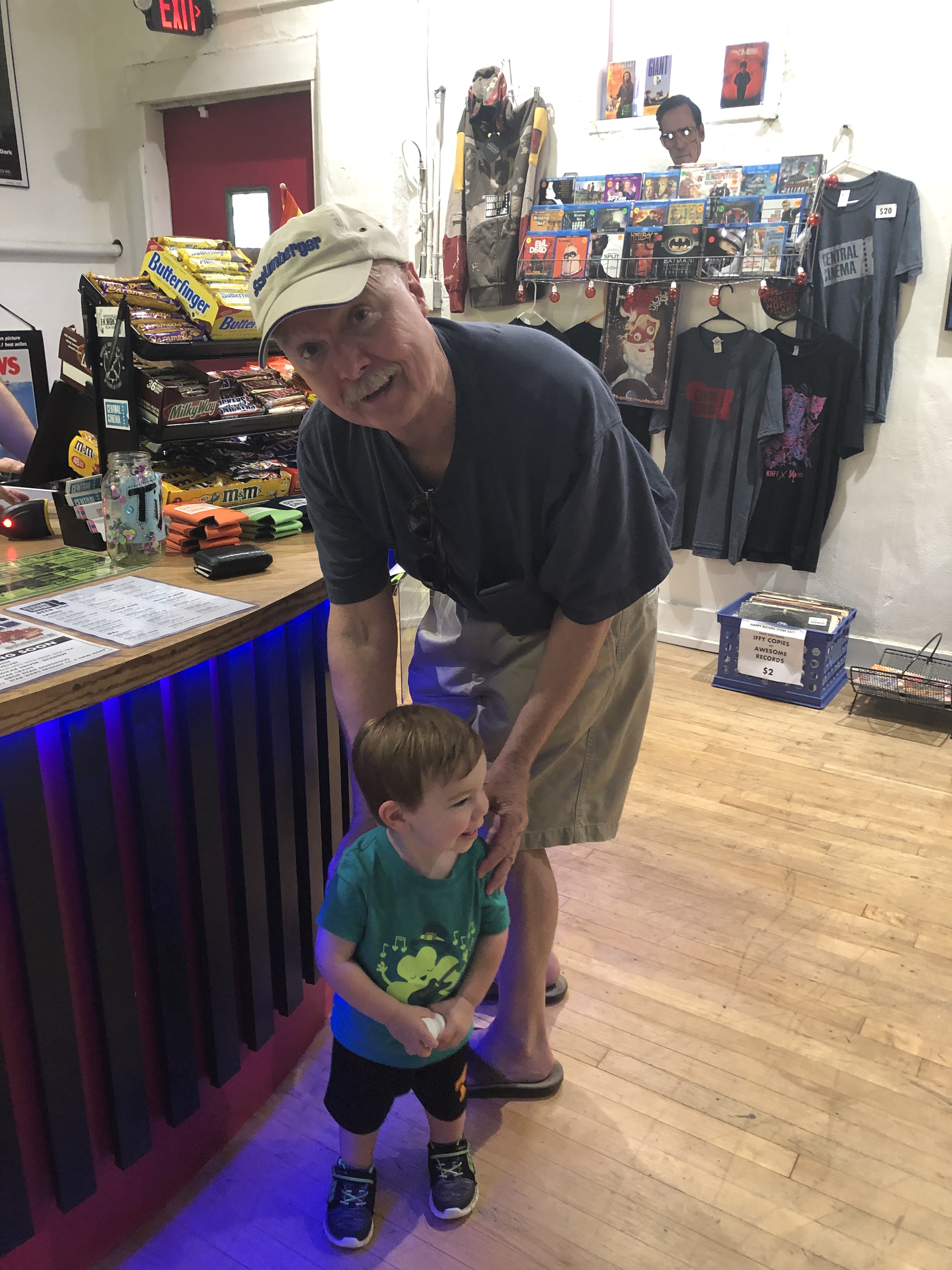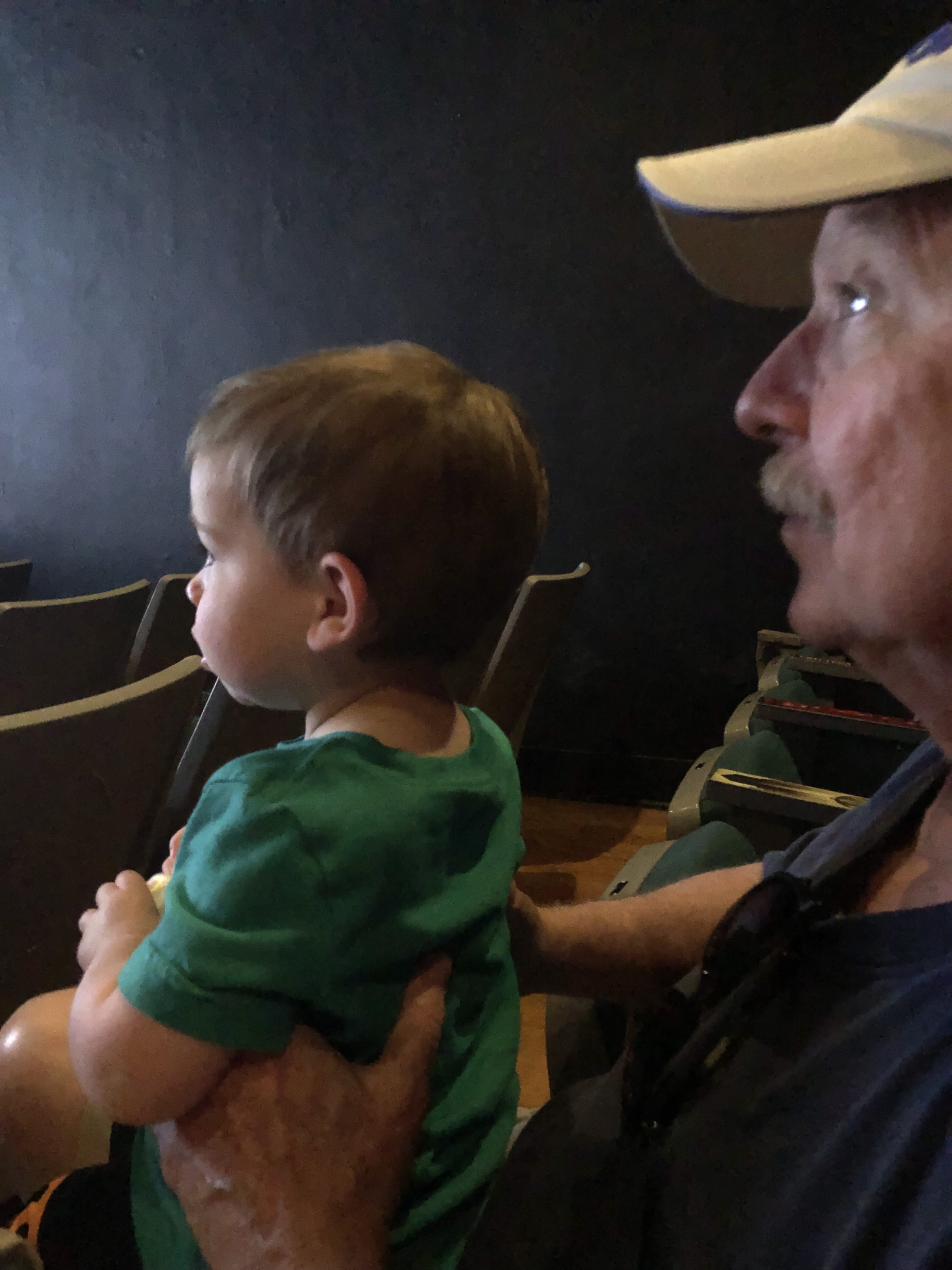 Our grandson’s first movie theater experience: Bugs Bunny cartoons on my husband Kurt’s lap. My Daddy, who