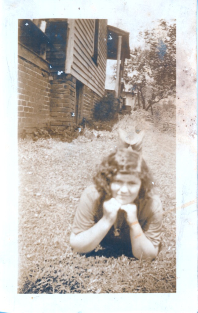 The best part of the homeplace clean up was discovering Mamaw’s active and adorable early life. The photos show Mamaw surrounded by friends and family. And Papaw! What a striking young man he was with his soulful eyes and matinee-idol looks. One close-up photo of Papaw’s face looks like the silent film star Rudolph Valentino who, as Wikipedia states, caused “mass hysteria” among his many film fans and was a cultural phenomenon. The photo shows Mamaw with a small hat on her head and a big fever blister on her lower lip, but she is smiling enigmatically and seems not to have a care in the world. Though his given name was James Thomas and his friends called him Tom, Mamaw called him Thomas and he called her Boots. I never heard how she got that nickname.