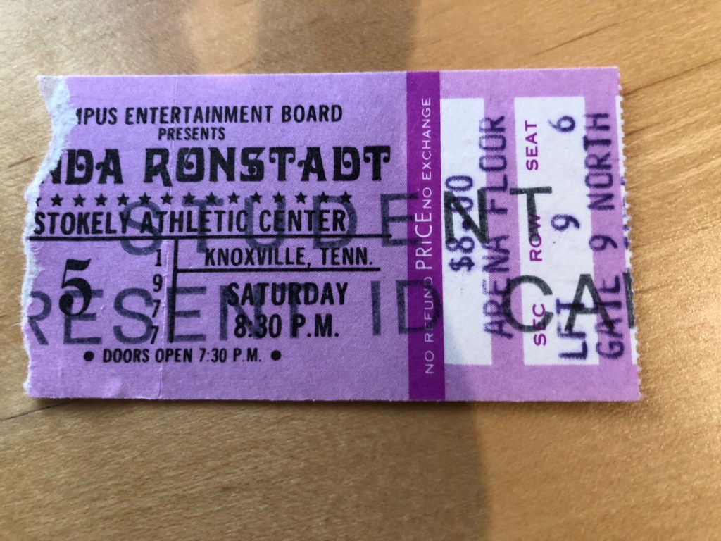 Why did I love the movie so much? I have been a huge Linda Ronstadt fan since the 1970s, and count myself among the lucky concert goers who have seen her multiple times. The first time I saw Linda in concert was at the University of Tennessee’s Stokely Athletic Center on Saturday, November 5, 1977, during the tour she did for her eighth studio album Simple Dreams. The reason I know the date of the concert? I still have the ticket stub in my memorabilia binder.
