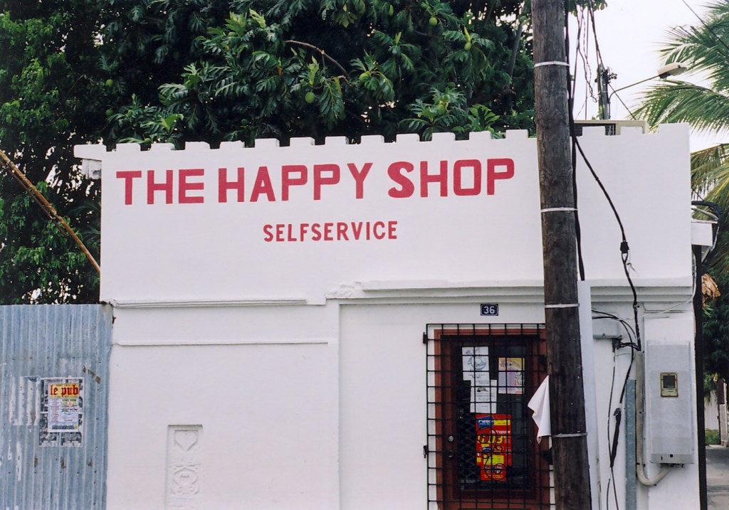 This is one of my all-time favorite photos of serendipitous signage. My husband Kurt and I were taking one of our few real vacations–as opposed to him working in the U.S., Canada, Europe, Central America, South America, or Africa and me coming along with him on the business trip. We were driving through the French side of St. Martin (one side of the island is French, the other side is Dutch) when I saw this building and told Kurt we simply must get this photo. He drove back and snapped this shot, and I must say that there is a great deal of truth here. Happiness is very much a self-service proposition. You must bring your own peace of mind to the rodeo because expecting other people to make you happy is an appointment with despair.