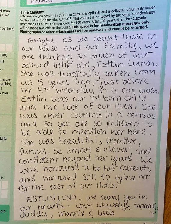 Many people who filled out the blank box on the Irish census form have shared on social media what they wrote. One woman named Amy Dutil-Wall composed a tribute to her much adored daughter, Estlin Luna, who was killed in a car accident when she was nearly 4 years old. She wrote: